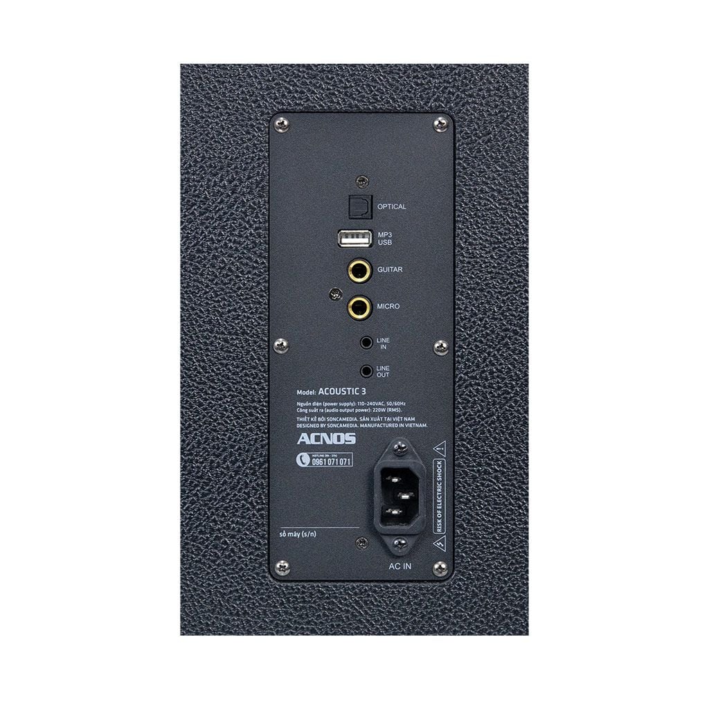 ACNOS Acoustic 3 Compact hỗ trợ đa dạng cổng kết nối, bao gồm USB-C (OTG), OPTICAL, USB MP3, Guitar, Mic có dây, Line In, Line Out và cổng nguồn AC. Nhờ đó, loa dễ dàng đáp ứng từ karaoke, nghe nhạc, biểu diễn acoustic cho đến livestream và thu âm.