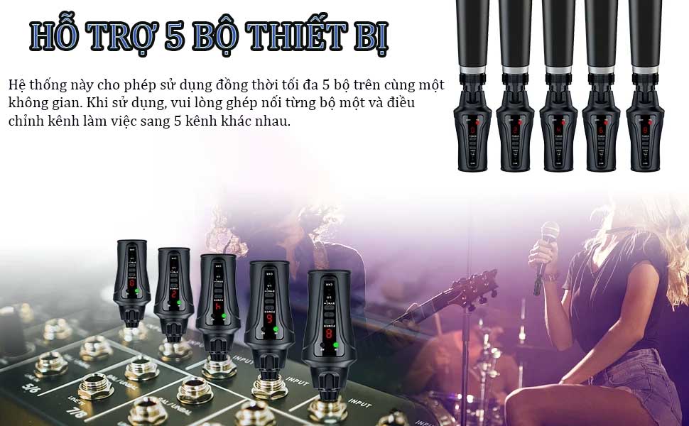 Thiết bị hoạt động trên dải tần UHF, hỗ trợ tần số khác nhau, cho phép nhiều micro sử dụng cùng lúc mà không bị nhiễu lẫn nhau. Trong trường hợp tần số bị gián đoạn, bạn có thể sử dụng mã ID để nhanh chóng kết nối lại giữa bộ thu và bộ phát, đảm bảo buổi biểu diễn không bị gián đoạn.