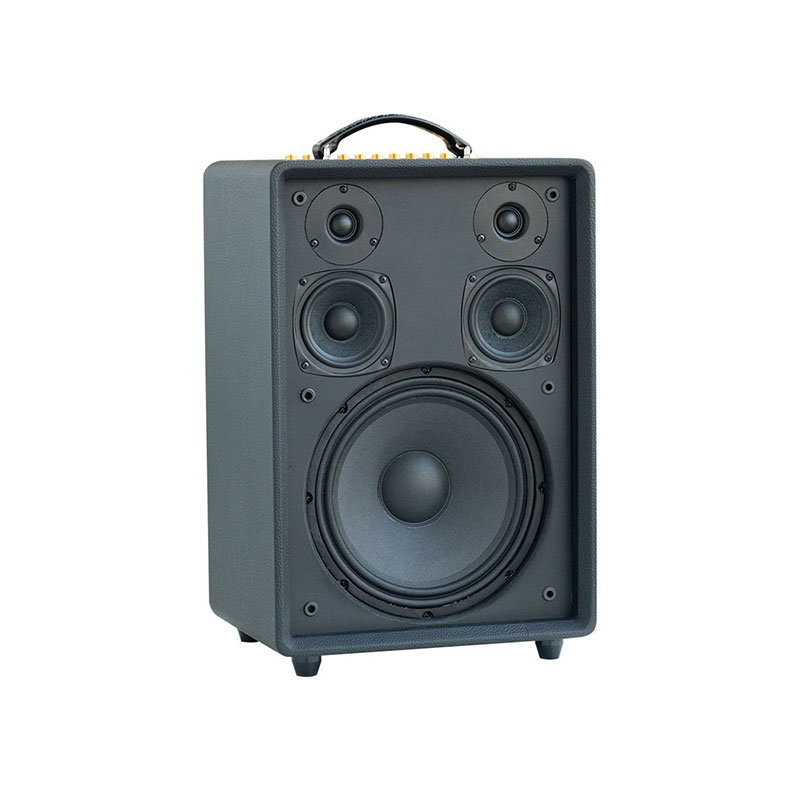 Thùng loa làm từ gỗ cao cấp bọc da giúp tăng độ bền và hạn chế va đập. Mặt ê-căng vải màu đen phối sọc nâu tạo điểm nhấn tinh tế, đồng thời bảo vệ hệ thống loa bên trong.