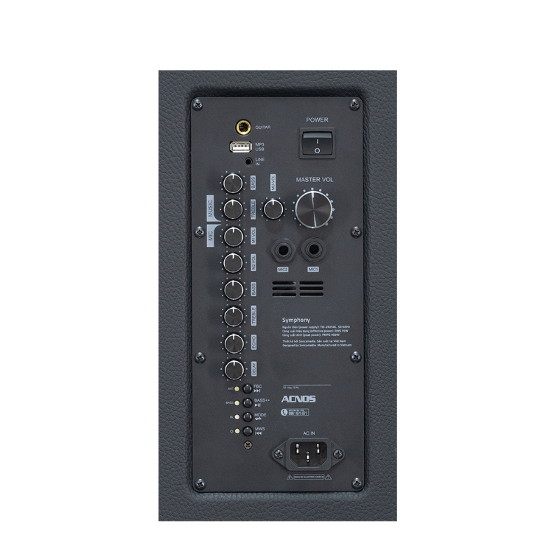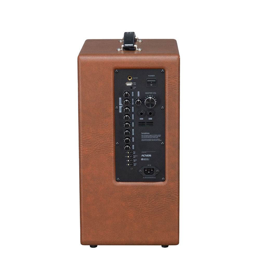Acnos Symphony sử dụng cấu hình 2 đường tiếng gồm loa bass 25cm kết hợp loa treble cao cấp mang đến dải âm đầy đặn, trầm chắc - trung rõ - treble sáng. Công suất 70W RMS / 400W PMPO đủ sức khuấy động phòng khách, quán café acoustic hay các buổi tiệc ngoài trời. Hiệu ứng âm thanh được xử lý bởi vang số chỉnh cơ tích hợp cho giọng hát bay bổng và cảm xúc.