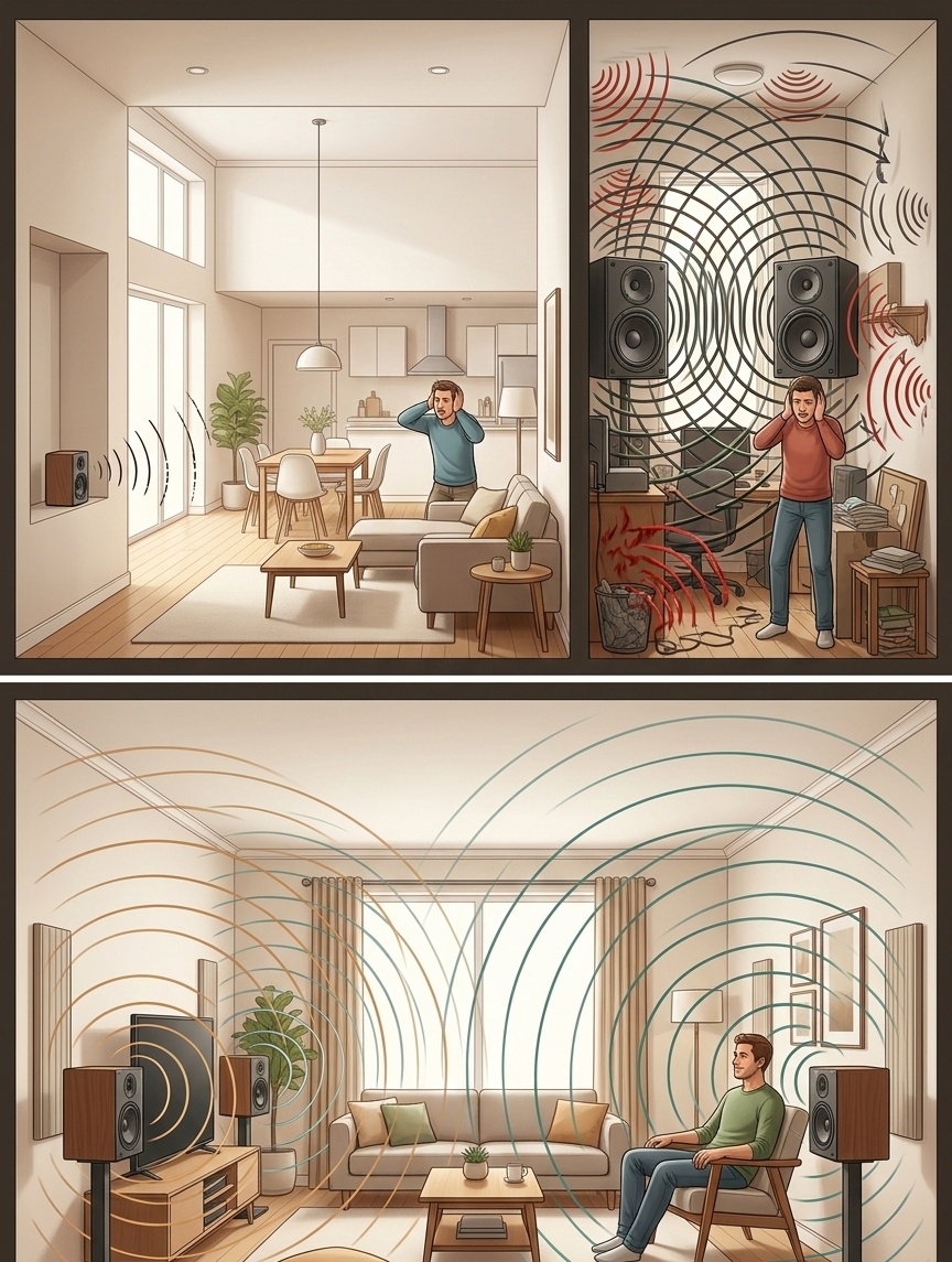 Một trong những yếu tố quan trọng nhất chính là không gian phòng. Âm thanh khi phát ra từ loa sẽ tương tác với tường, trần nhà và đồ nội thất xung quanh. Nếu đặt một chiếc loa công suất lớn trong phòng nhỏ, âm bass có thể bị dội lại nhiều lần giữa các bề mặt, khiến âm thanh trở nên ù và thiếu rõ ràng. Ngược lại, nếu sử dụng loa quá nhỏ trong không gian rộng, âm thanh có thể thiếu lực và không đủ lan tỏa.