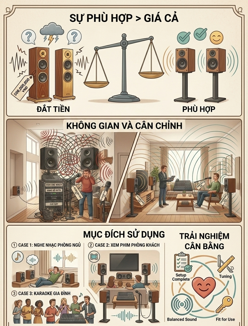 Nói một cách đơn giản, loa đắt tiền có thể rất hay, nhưng chưa chắc đã hay trong mọi hoàn cảnh. Điều quan trọng không phải là tìm chiếc loa đắt nhất, mà là tìm chiếc loa phù hợp nhất với không gian và mục đích sử dụng của mình.
